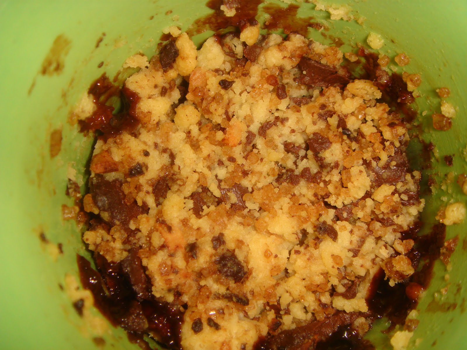 To make the crumble, place the flour and butter in a bowl and mix it with finger tips till it forms a mixture like bread crumbs. Now add the sugar, chocolate and almonds