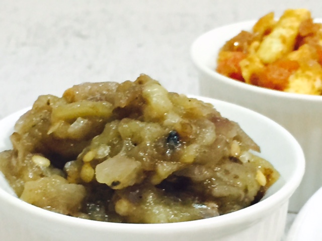 Roast the brinjal in open flame. When completely cool, remove the skin, Mash it well and keep aside