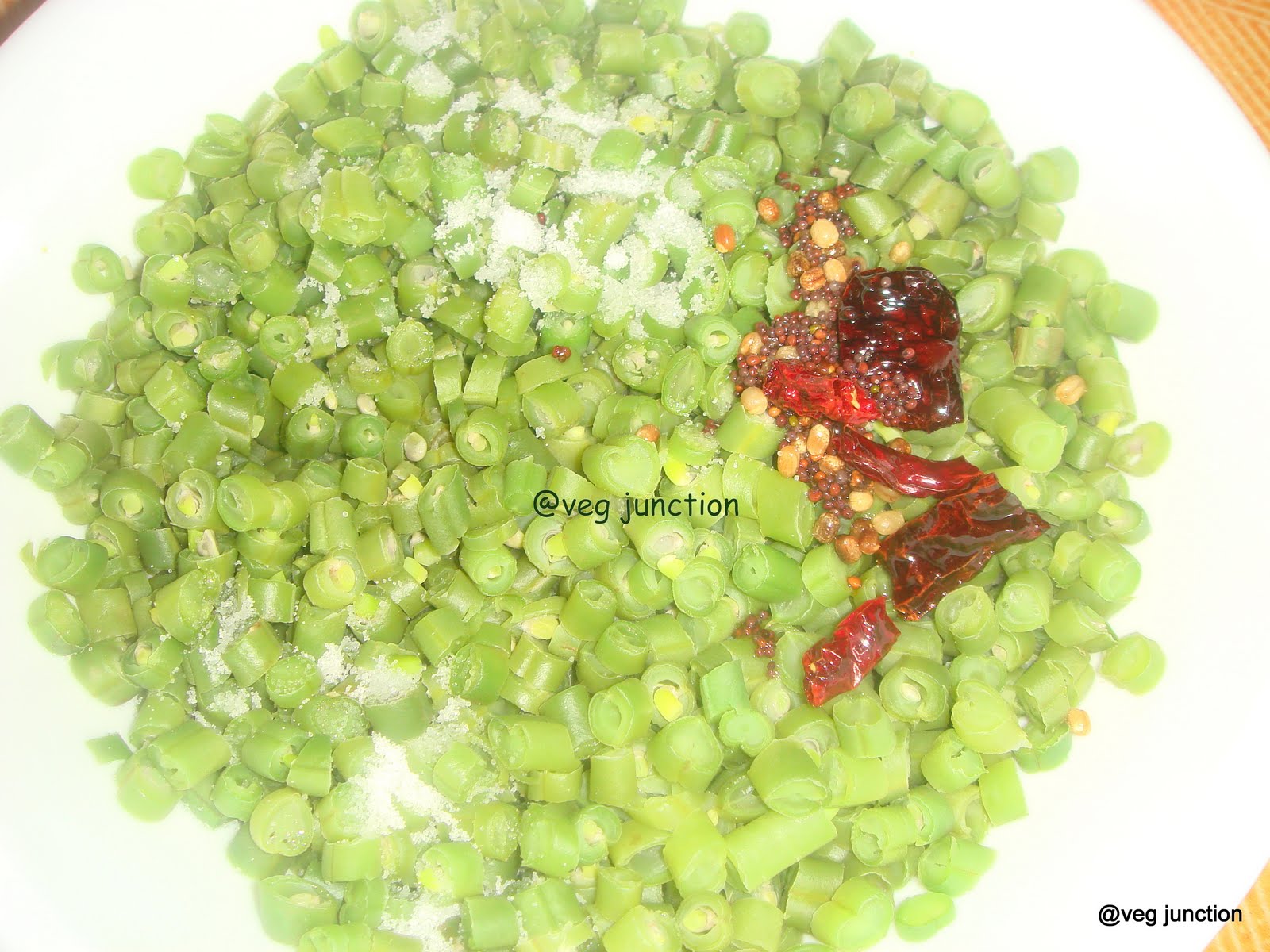 Wash and cut the beans into even sized small bits. Chop them as evenly as possible for an uniform cooking.