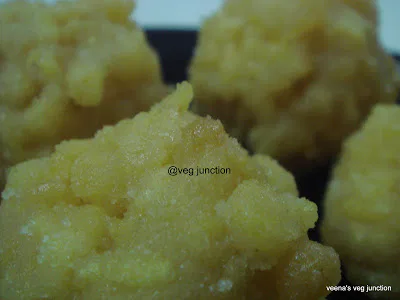 After 4 hours you can see that all the moisture is absorbed and the boondhi is ready to be mae into laddus. Take a handful of the mixture and roll them into laddus. If you are using cashew or raisins you can add it before making it into laddus