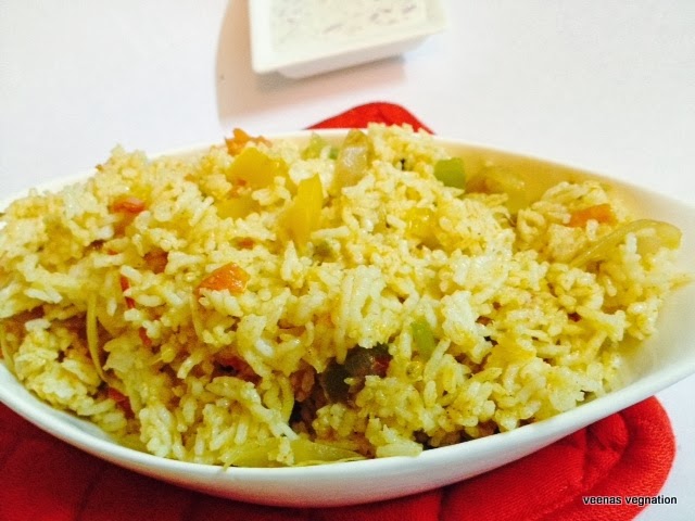 I love to use the tricoloured bell peppers whenever available. Earlier we would see that only in magazines but now we find it across all seasons .For the fourth week of BM #34, I will be blogging about capsicum dishes. For day one it is an one pot meal, easy to prepare with lots of flavours and lovely colours.
