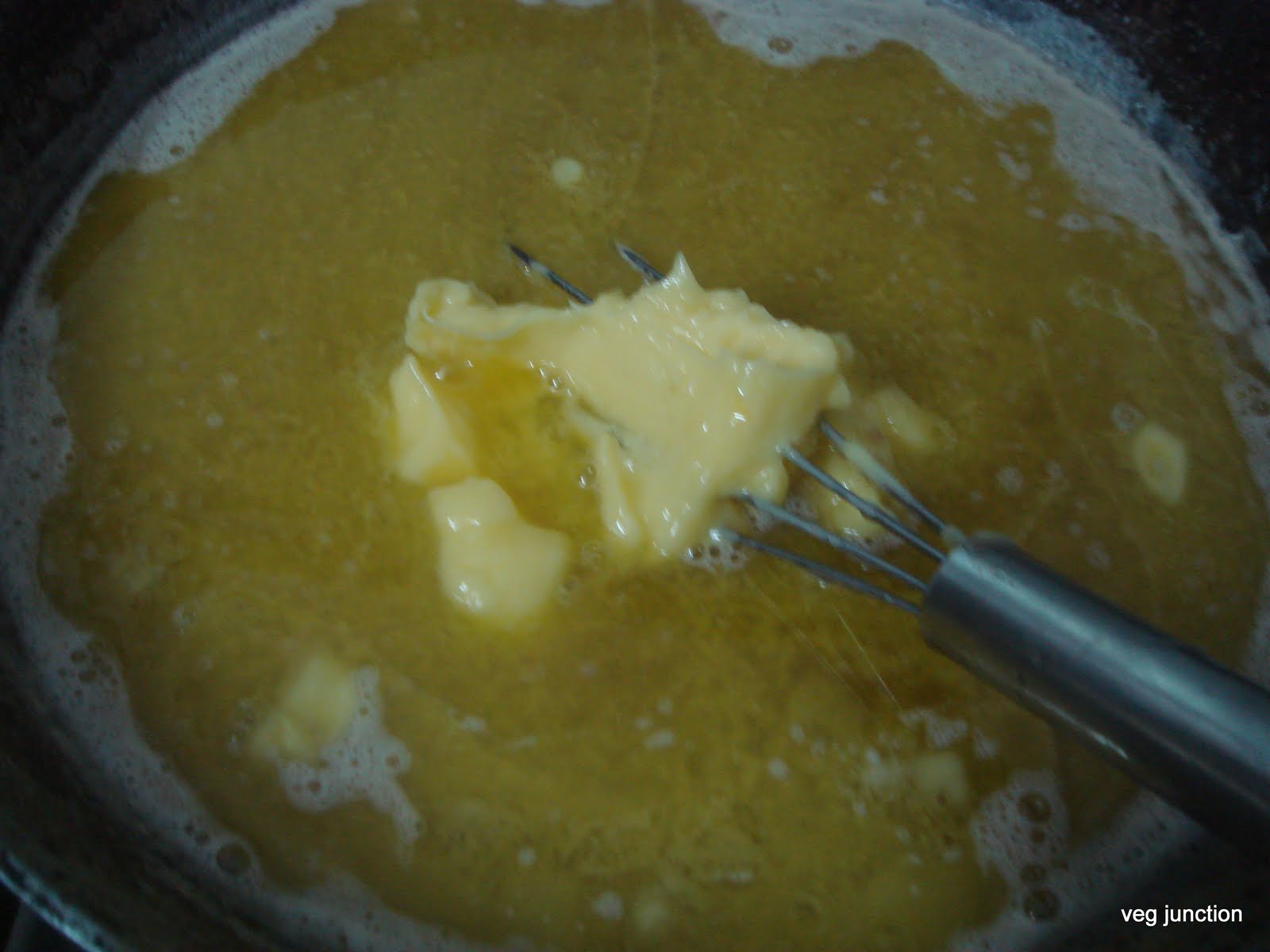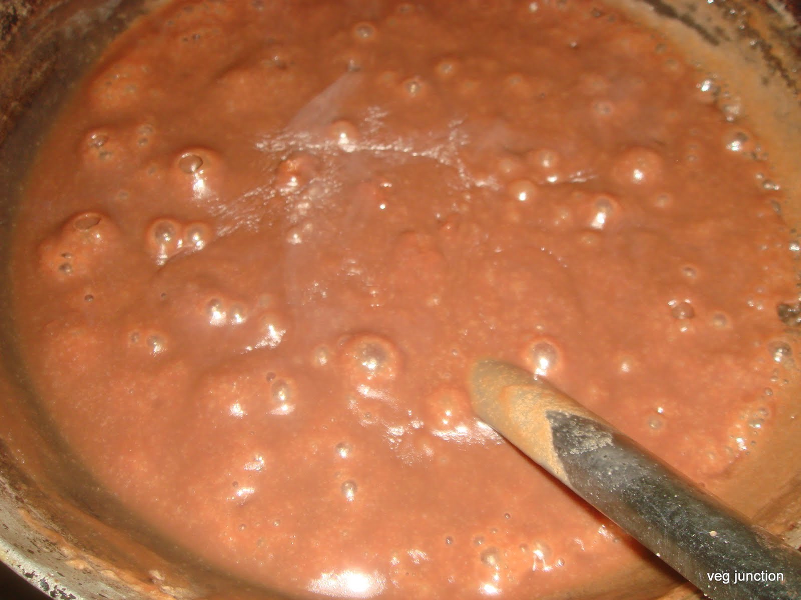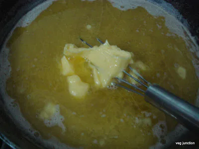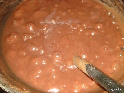 Reduce the heat and add the sugar. Mix well. Now add the butter and cocoa powder and mix thoroughly.