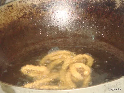 Flip the murukku over when it starts to brown.Take out the murukku from hot oil when all the bubbles in the hot oil has subsided. Drain it in a colander.