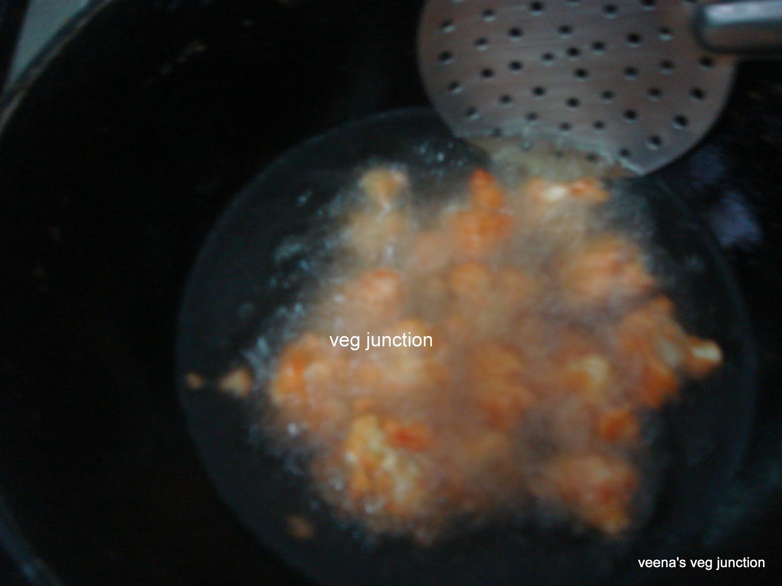Now heat the oil in a kadai and when it is ready add few florets and deep fry till done.Fry in small batches for even frying. Be careful not to hurt yourself or others around you while deep frying