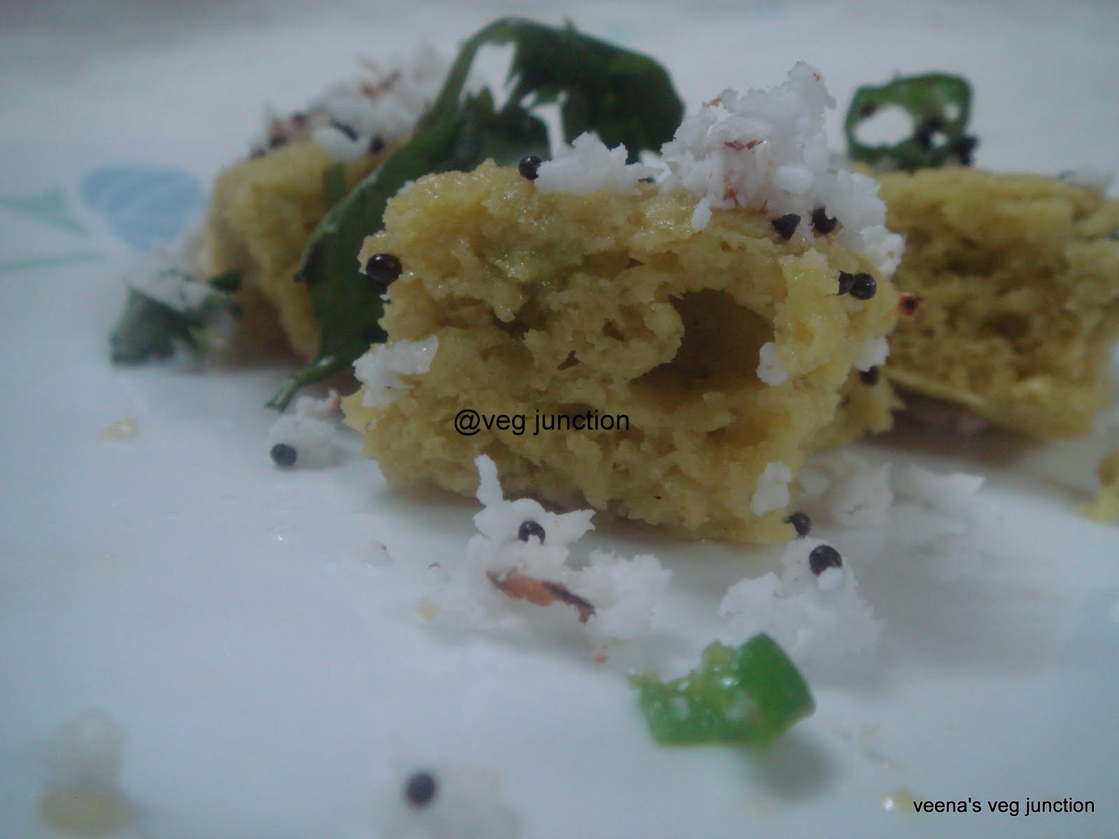 Now take a frying pan, add oil and mustard seeds. When it splutters add the green chillies and saute for a sec. Switch off the flame and add 2 tbsp of water to this. Pout this on the prepared dhokla.
