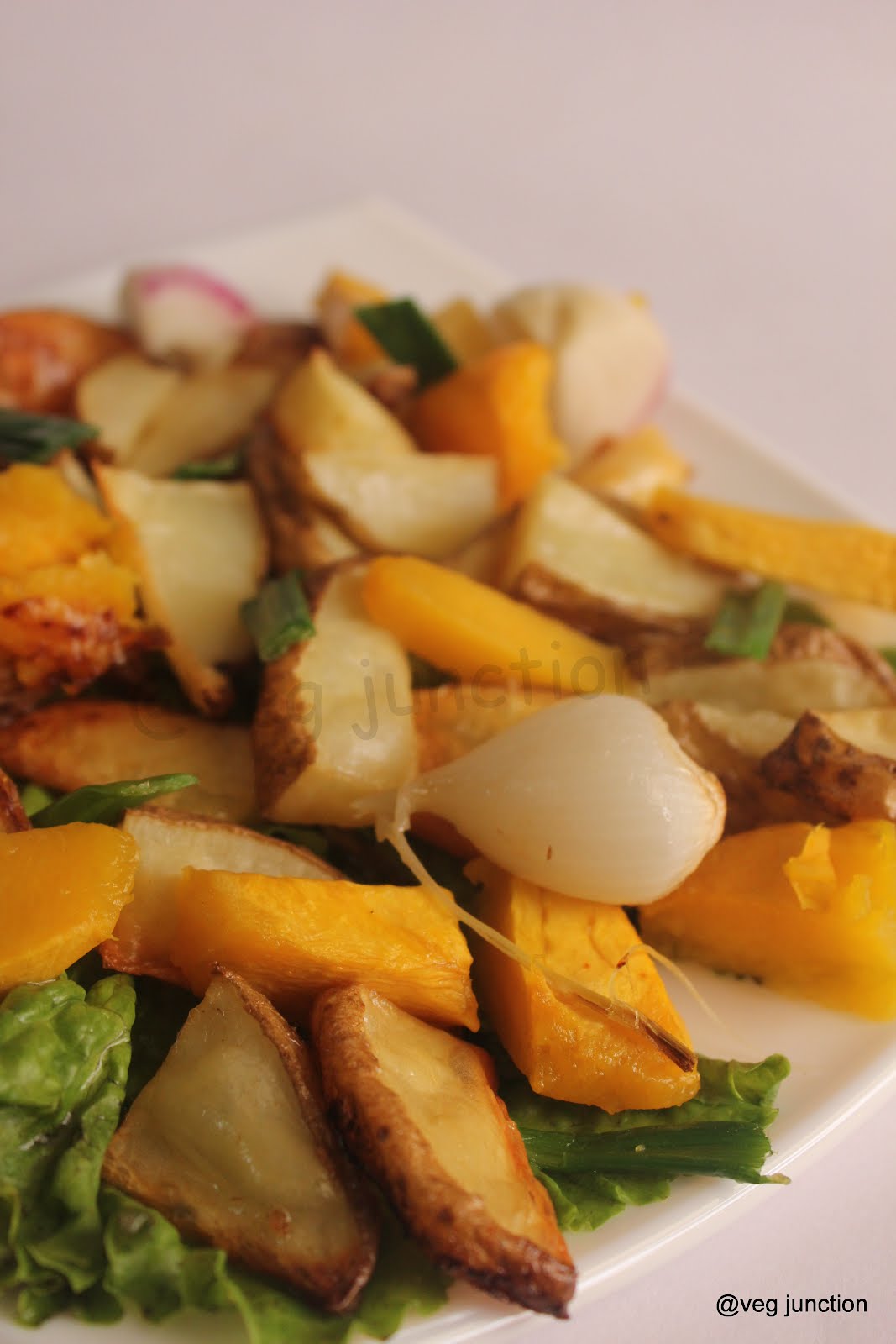 Oil the tray well. Spread these cut vegetables evenly on the tray. Make sure that the pumpkin has its skin on the top.