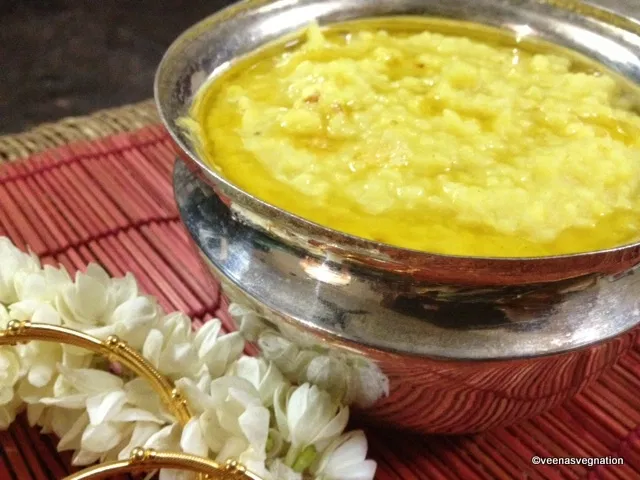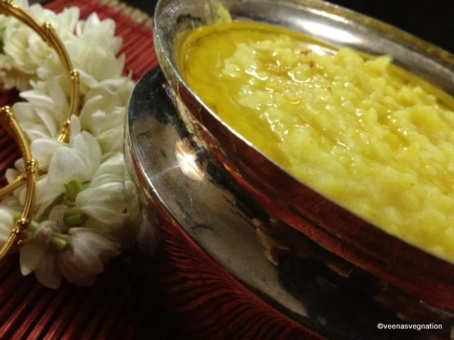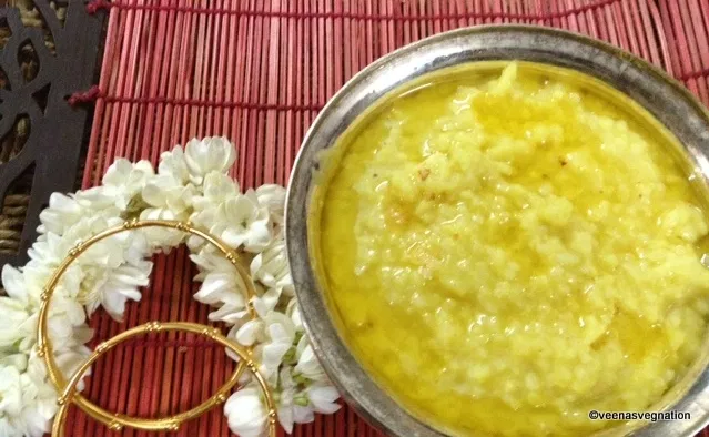 From today onwards, for 7 days, the theme for Blogging Marathon #27 is to blog about Tradition and recipes that are prepared by tradition.I wanted to start of with Manja Pongal. Manjal pongal is generally prepared for Sumangali Prarthanai.This is a ritual seeking the blessings of women who are no more . This ritual is done with utmost care. 7 sumangalis (Married Women)and a Kanya Ponnu(Young girl child) are invited.After the initial Nalangu, where the hostess, applies turmeric to the feet of the invited women and the aarathi, they are asked to take head bath and they wear the saree given by the hostess.Later on the prepared feast is offered to the women.On this day, the women are to partake with the food first, and then the hostess seeks the blessing from all the women and only after that do the rest of the family partake the food.Manjal is turmeric and is associated with everything auspicious and sumangali prarthanai is performed whenever there is an auspicious occasion at home like a wedding or Poonal or thread ceremony and this manja pongal features there!!Now to the recipe