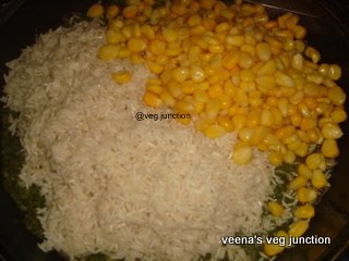 Now drain the water and add to this cooked mixture. Also add the corn to this. Mix well