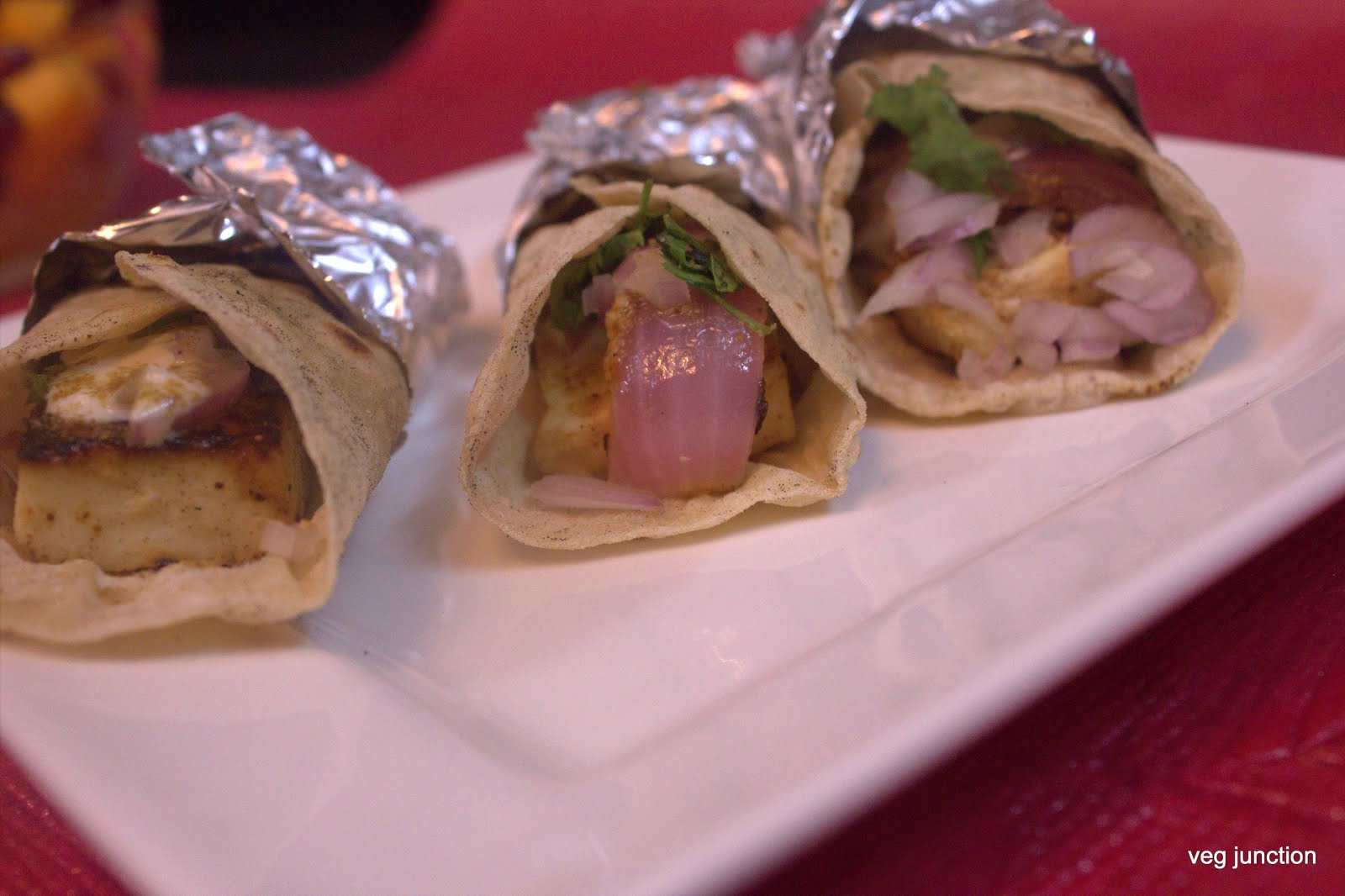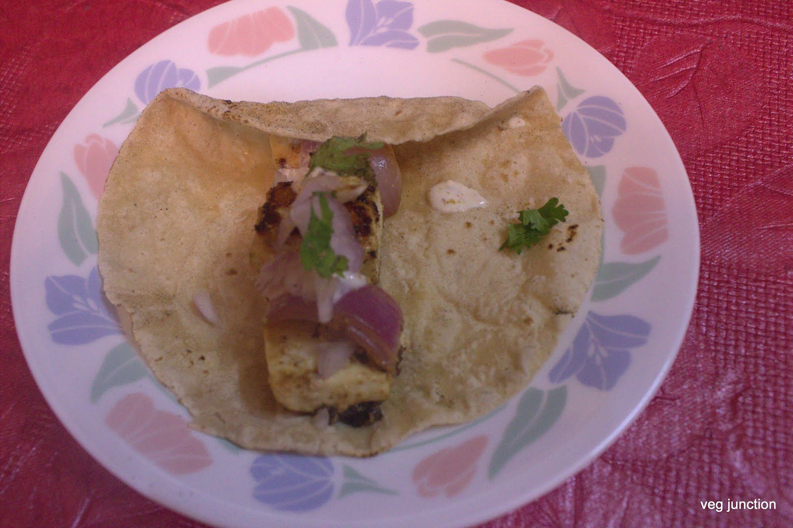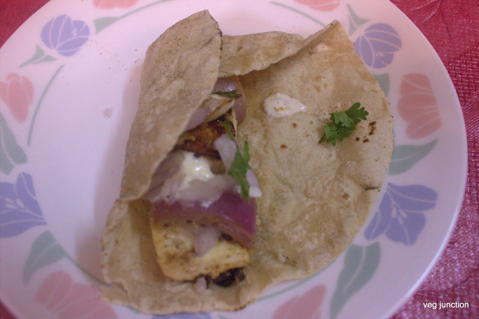 Place a chapathi/tortilla and arrange the paneer tikka in the center