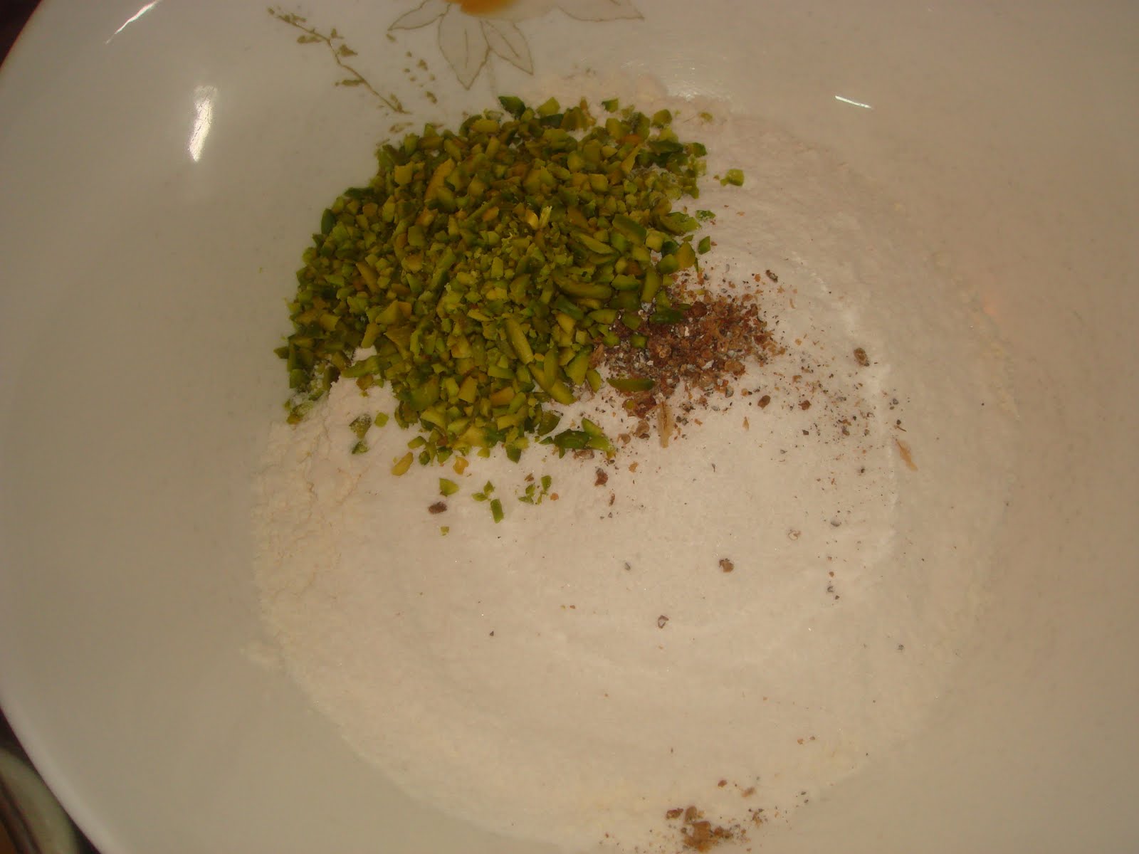 Add the powdered sugar, cardamom powder, chopped pista to this