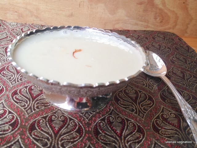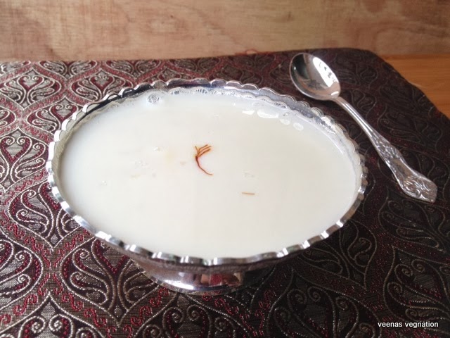 In a big pressure cooker, add the washed rice, milk, sugar and saffron strands . Mix well