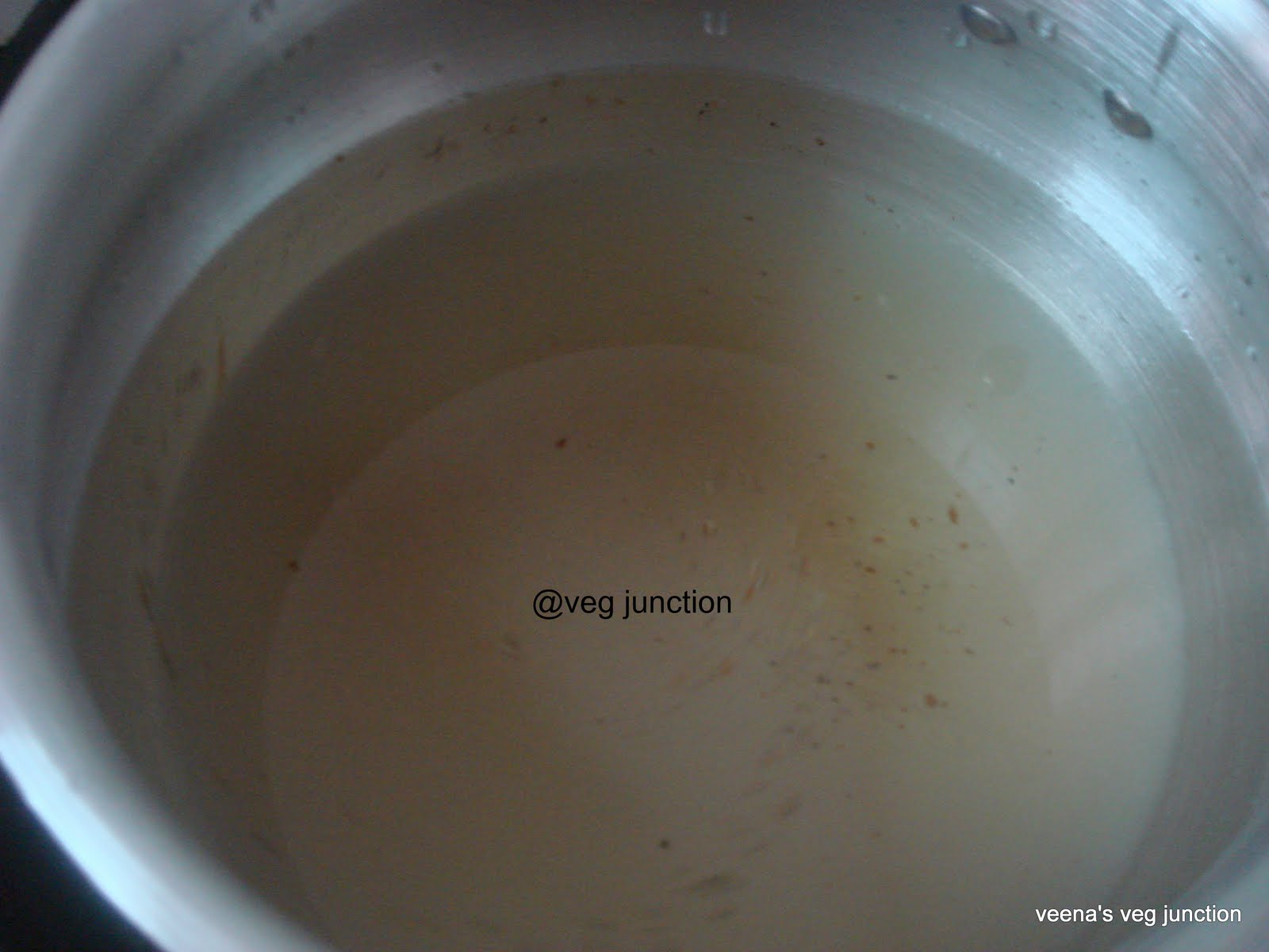 In a Pressure cooker add the sugar, water and cardamom powder.Boil it on a low flame till the sugar dissolves.