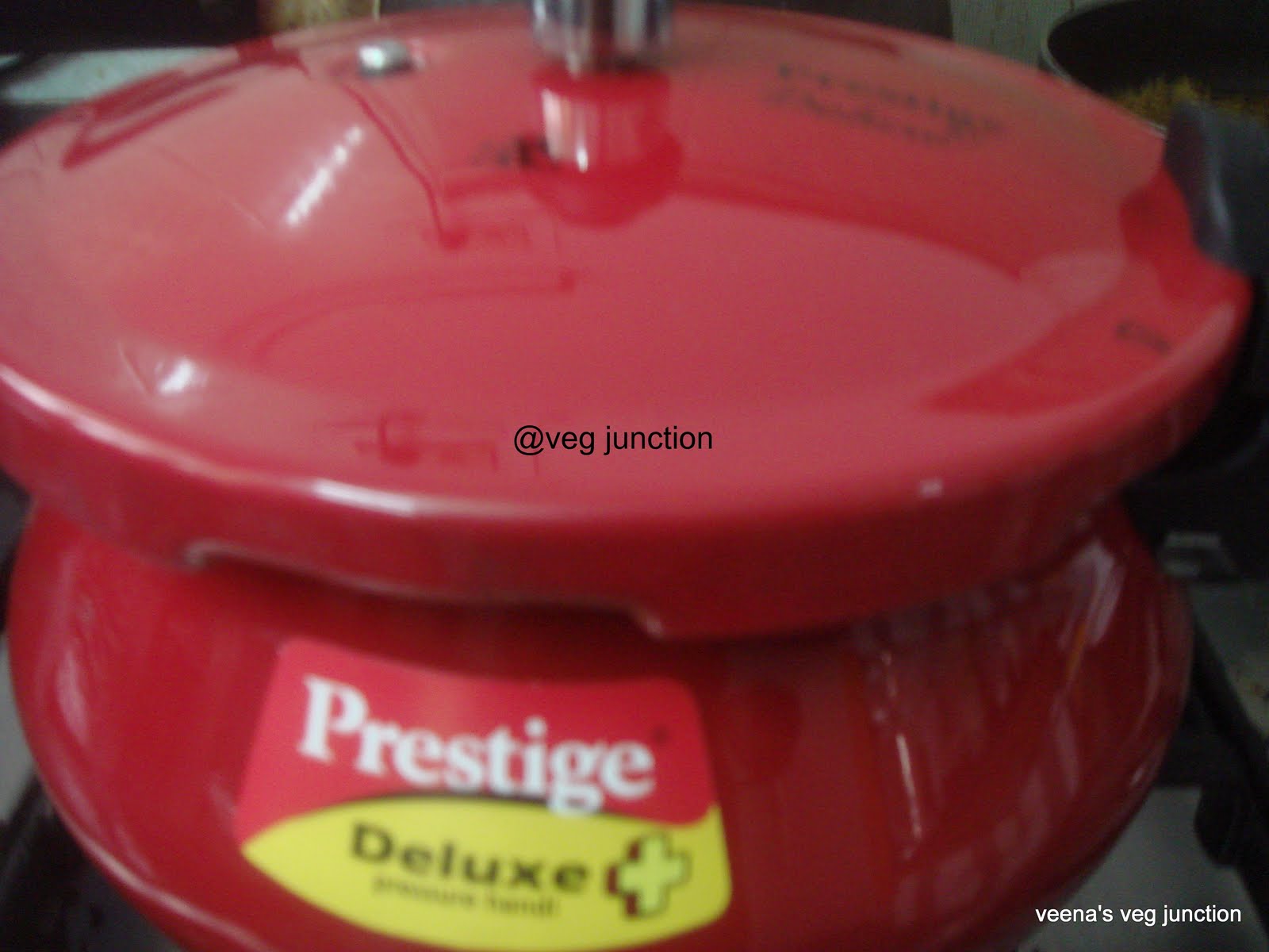 Close the lid and when the pressure build, put the weight on and let it cook for 1 whistle. Then simmer it for 5 more minutes in a very low flame. Switch off the stove