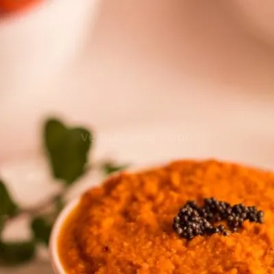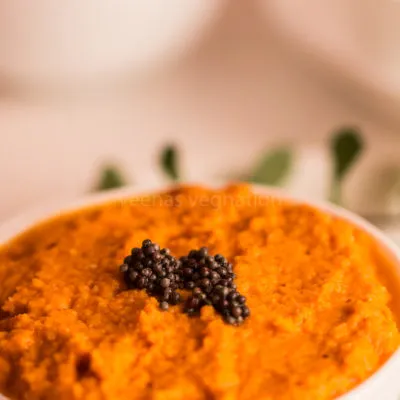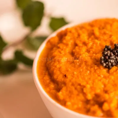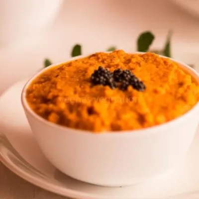 Now grind it with the carrots into a smooth paste with minimum water. Transfer it to the serving dish
