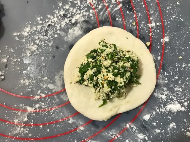 FOR THE OUTER COVERINGMix the flour, salt, sugar and yeast in the bowl of the stand mixer. Slowly add 3/4 cup of water and oil and run the mixer in first speed till it comes together. Now increase the speed to 1 and let it knead the dough well for another 7 minutes. Take it pout and transfer it to a well greased bowl. Cover it and place it in a warm place for it to double in volume |