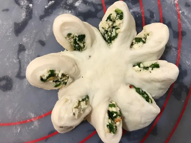 For the third day of alphabetical baking , is a savoury bake from turkey known as Cicek Pogaca which means flower shaped pogaca. According to Wikipedia, It is also called as pogacice eaten in Bosnia, Bulgaria, Slovenia, Serbia and Turkey. The outer layer can be done with filo pastry or the usual pizza bread dough and usually is served as an appetizer. These are usually filled with potato filling with loads of feta cheese stuffed in it.