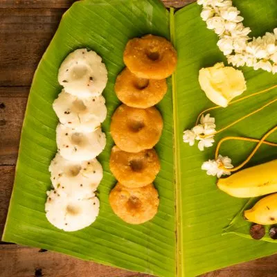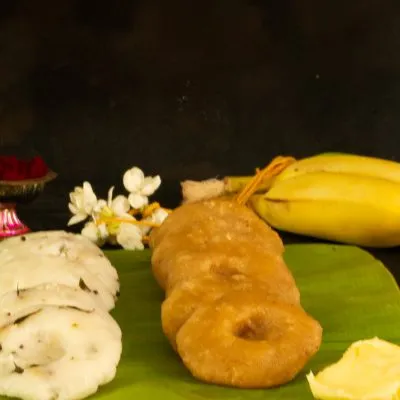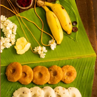 Place the banana leaf. Clean it well. Now tie a single flower to the center of the sacred yellow thread. Keep it on the leaf. Place vella adai, kara adai, butter on the leaf. Now first tie one prepared thread to the idol of the goddess if you have one. Place kumkum on her forehead. Next, you apply kumkum on your forehead. Keep some flowers to the goddess. If you can, keep a string of flower on your hair too. Now sit down in front of the banana leaf, pray the above-said prayer by Savitri. Then tie the sacred yellow thread around your neck. Offer the prayers to the lord, do the namaskaram to the lord and the elders of the house and break the fast by partaking the vella adai and butter as prasadam. Later have the kara adai too.