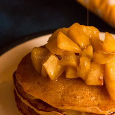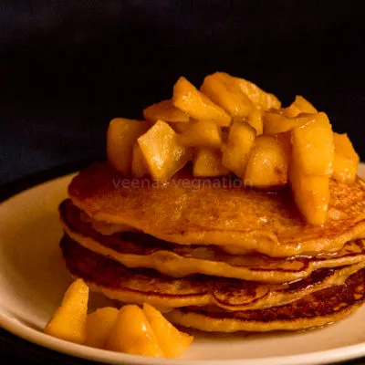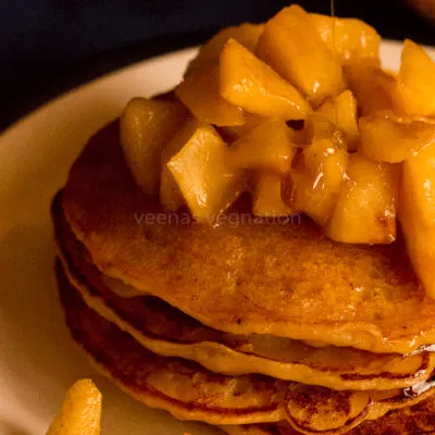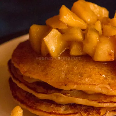 These pancakes are mildly sweet, and the applesauce and the banana in it makes it quite soft and fluffy.The topping is again cinnamon flavoured apples, further sweetened with the addition of honey. If maple syrup is available to you, you can substitute the honey with maple syrup.I would just stick with the honey as the price of maple syrup here in India is exorbitant.