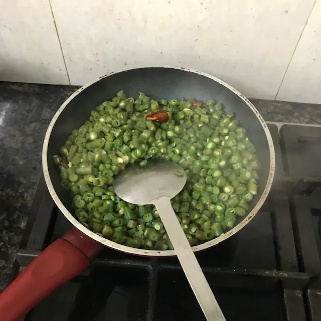 By now I check and see that the beans are ready for tempering. So I remove the rasam and keep it aside waiting for the dal to be cooked.