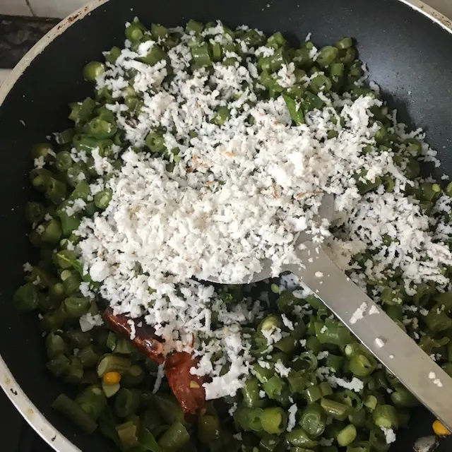 As we wait for the rice to get cooked, I add oil, mustard, Bengal gram dal and curry leaves and wait for it to splutter in the kadai. Once it splutters, I add the cooked beans and salt and mix well and let it cook for another 2 minutes. Now I add the coconut scrapings, mix well and the curry is ready. I remove this from the fire and bring back the rasam. Add a portion of the cooked dal and the water in the dal to this and let it boil.