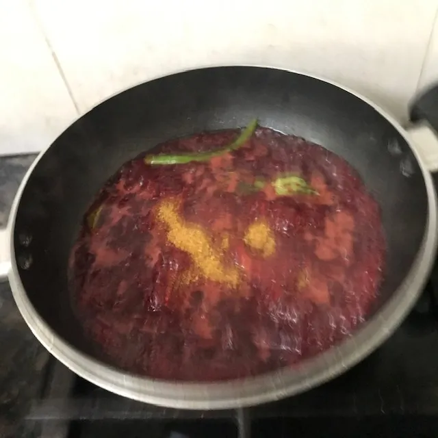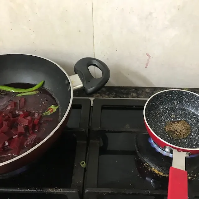 I heat the oil in the bigger kadai with mustard seeds, fenugreek seeds and curry leaves. Once it starts spluttering, I add the cooked beet into it and mix well and cook for 1 minute. Next, I add the tamarind extract and salt and cook for 3 minutes.