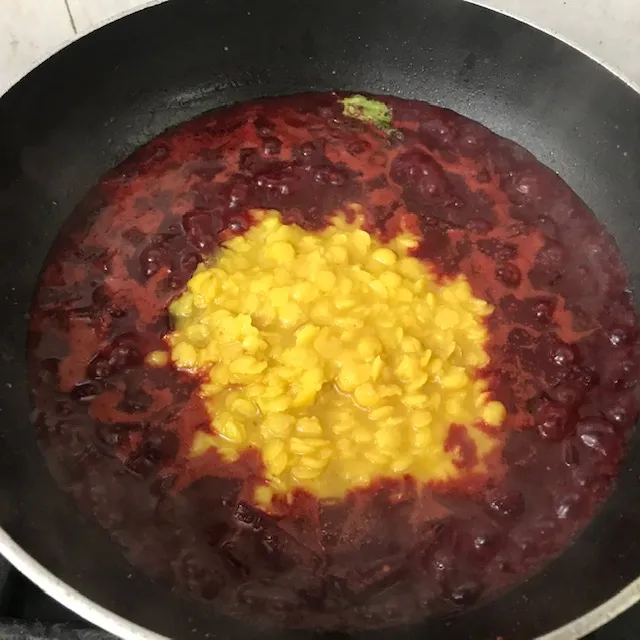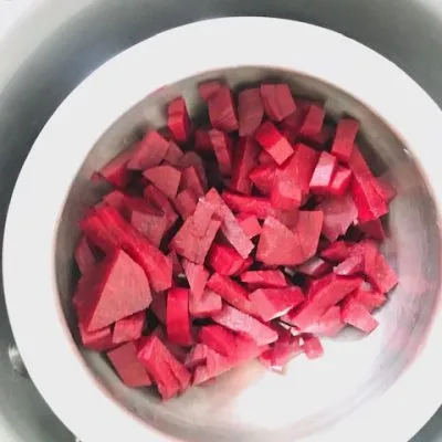 In one cooker I have put the dal with water and turmeric powder plus a few drops of oil. On this, I have stacked the beetroot in another vessel and cooked it in high for 4 whistles