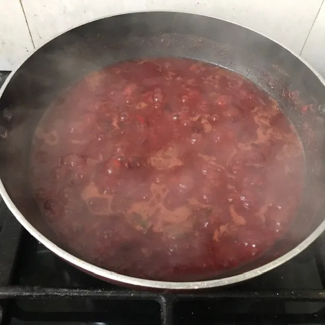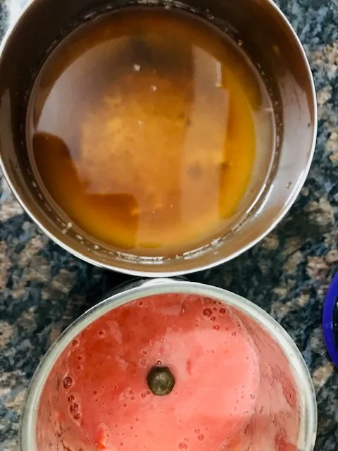 There are no whistles yet, So I immediately cut and grind a tomato for the rasam in a mixer and add it to the tamarind juice.