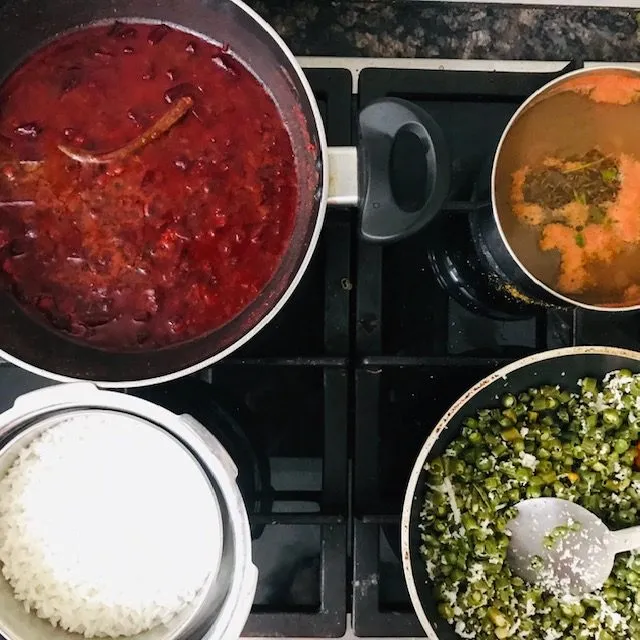 Here is a very quick and easy method to cook sumptuous south indian meal in just under 35 minutes which includes rice, sambar, rasam and poriyal