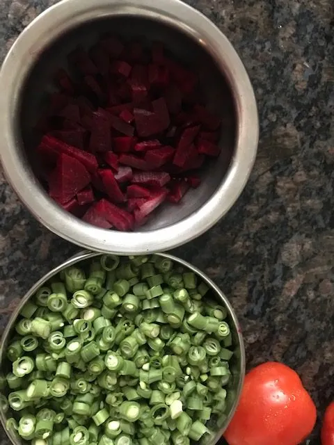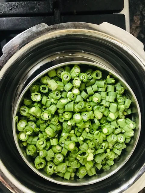 I have cut the vegetables previous night and packed it in a box and kept in the refrigerator. If you a quick in cutting vegetables, you can choose to cut the beans just while starting. Let us start cooking