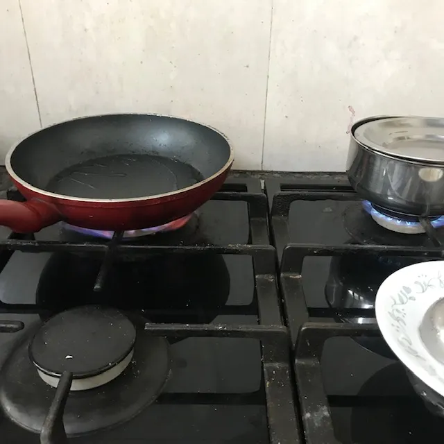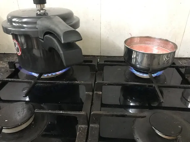 The smaller cooker with the rice and the necessary water is now up for cooking on this burner while a small kadai goes into they smaller burner.