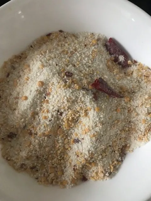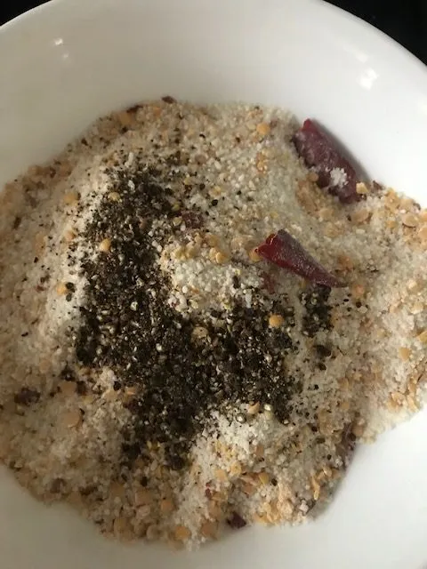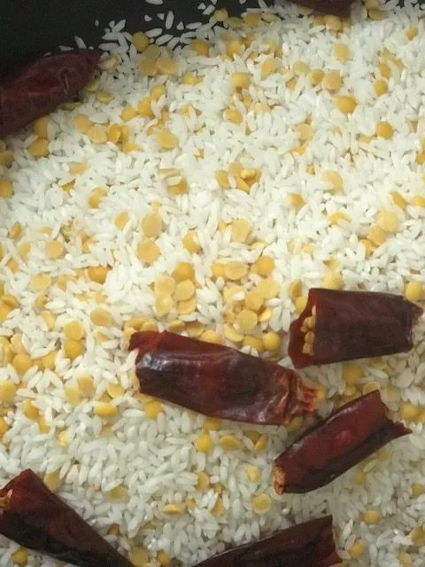 Let us see how we can easily prepare this instant arsi upma mix at home with very simple ingredients. Here the main ingredients are raw rice, toor dal, red chillies. We will be adding some pepper and cumin for flavouring too.