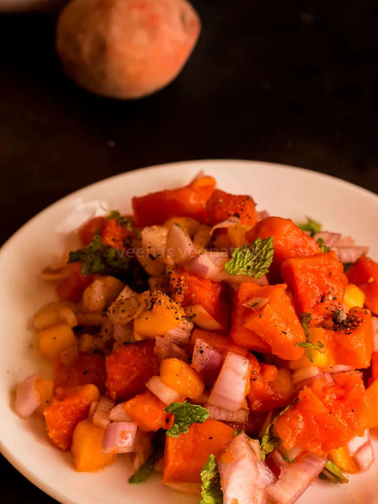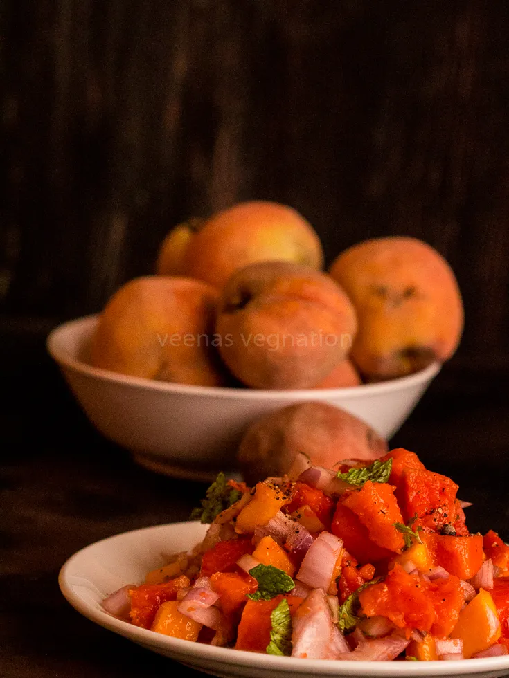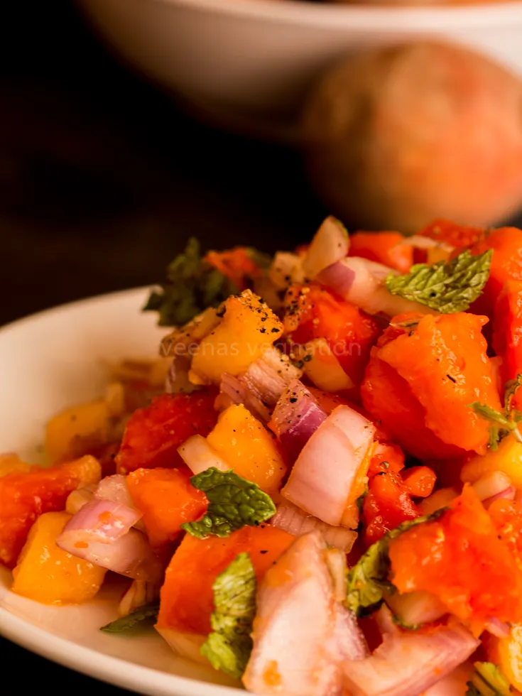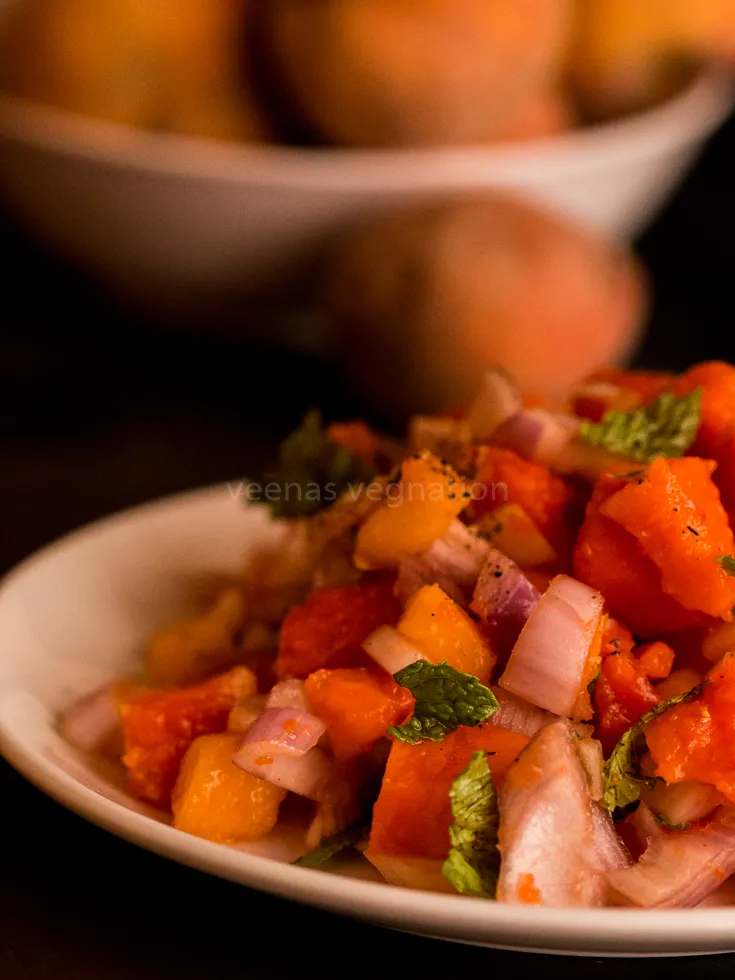 Peach is available only in summer here and these fruits add a lovely texture and taste to the prepared dish. Papaya added a subtle sweetness to the salad. The fresh green mint breaks the summer tone of colours and it adds a distinct flavour to the salad.