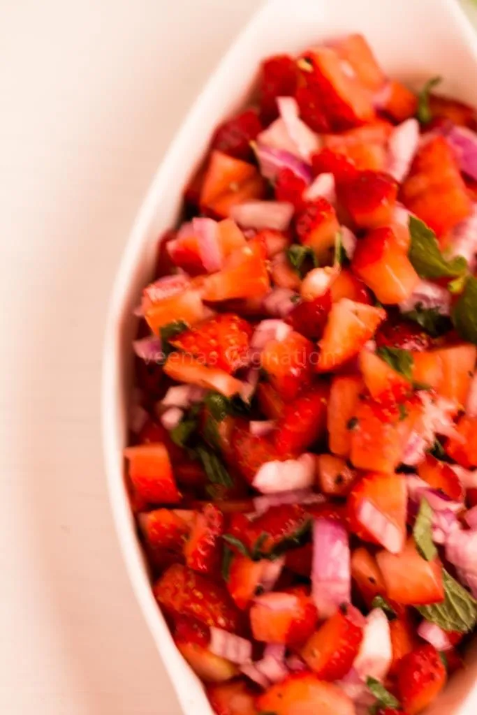 | 1 Done | Chop strawberries, onion , bell pepper and onion into small cubes. Chop the mint leaves finely |