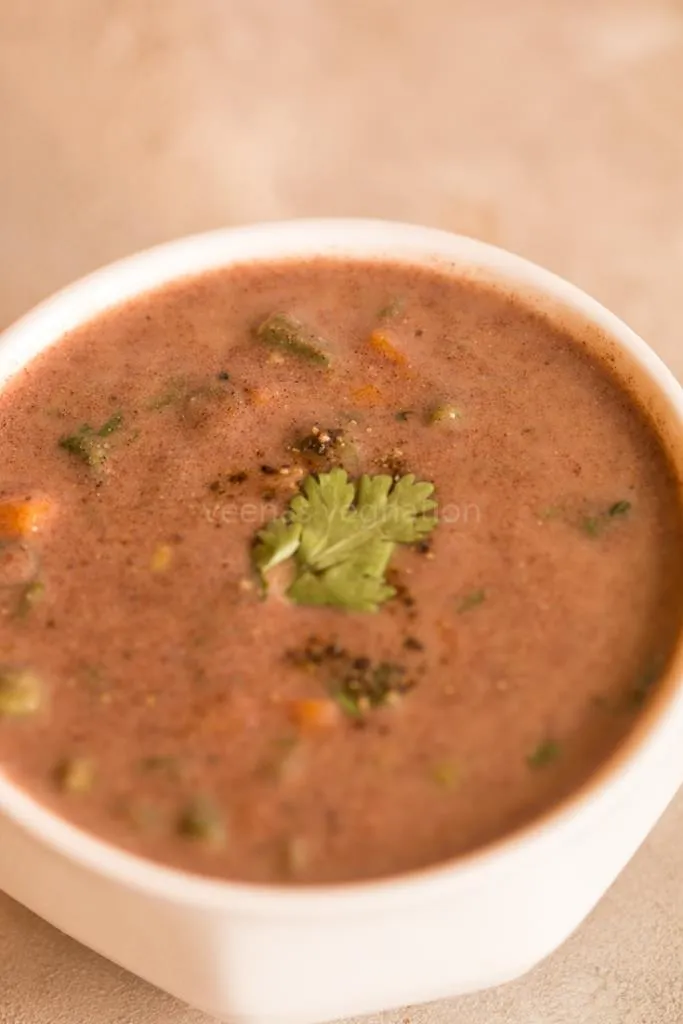 Add more water and salt . Add the blanched vegetables and cook for few minutes till it starts to thicken.Now add the spice powder, cook for 1 minute and switch off the fire |